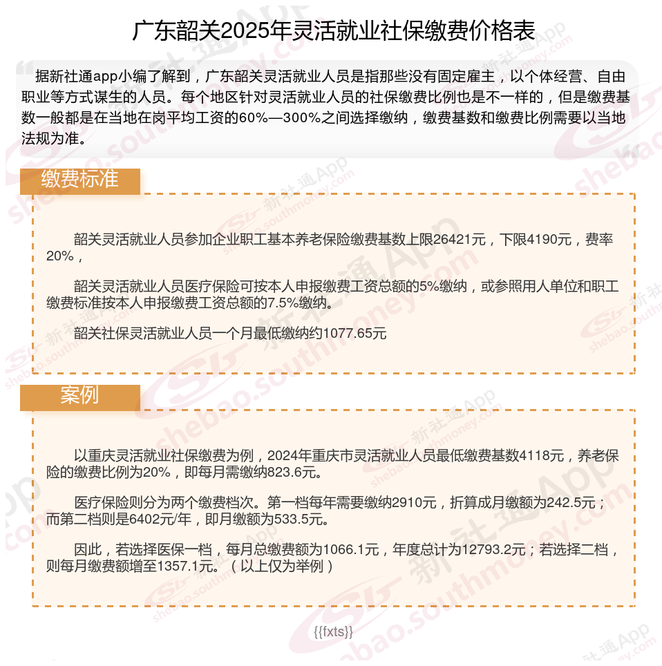 据新社通app数据显示,广东韶关灵活就业养老缴费基数明细如下: