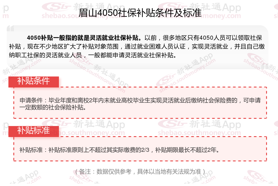 二、2025年眉山4050社保补贴标准及条件,最新如下: