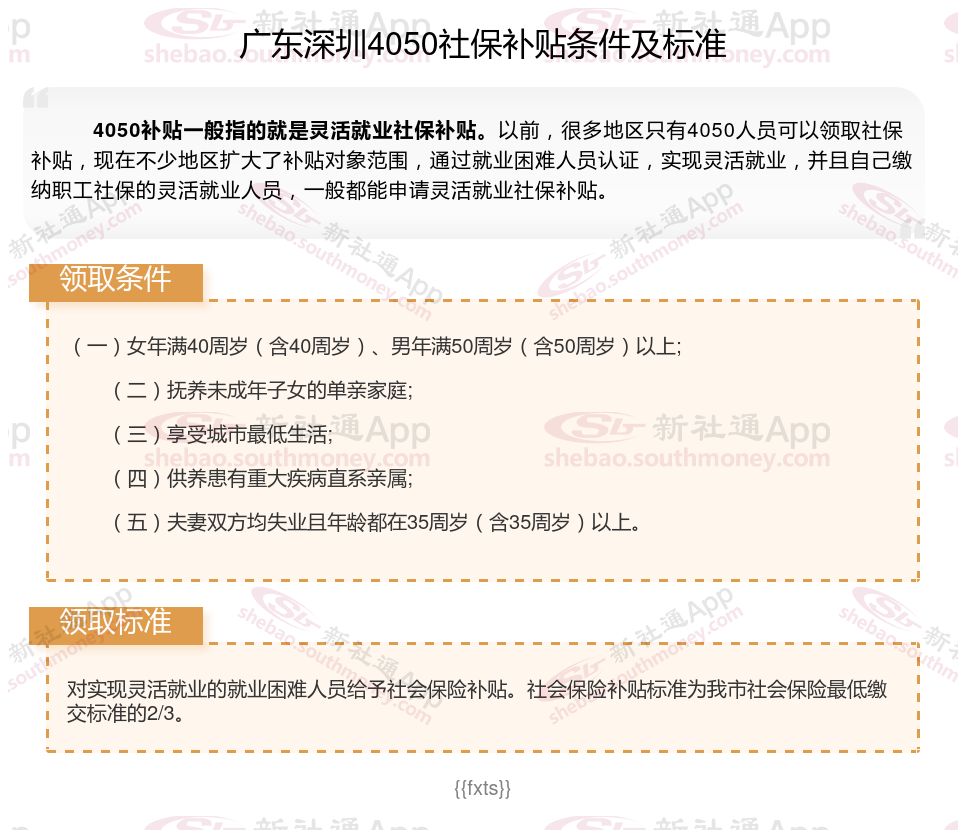 “灵活就业4050社保补贴”是指灵活就业困难人员社保补贴。该方案是对就业困难人员灵活就业后办理了就业登记手续并参加社会保险的,给予社会保险补贴。那么广东深圳4050灵活就业困难人员社保补贴标准是多少?广东深圳4050社保补贴需要符合什么条件?接下来随新社通APP小编了解一下最新资讯。
