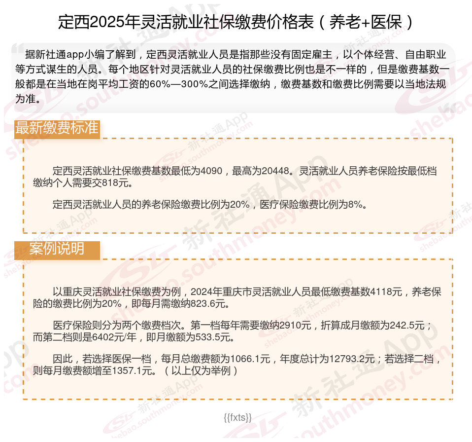 据新社通app数据显示,定西灵活就业人员养老保险缴费基数2024-2025年最新标准如下: