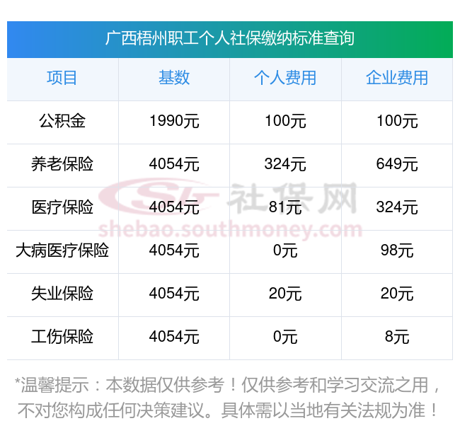 广西梧州五险最少要交多少钱一个月多少钱?下表是2024-2025年广西梧州社保费用明细参考,新社通app-社保缴费查询工具提供的最新数据如下: