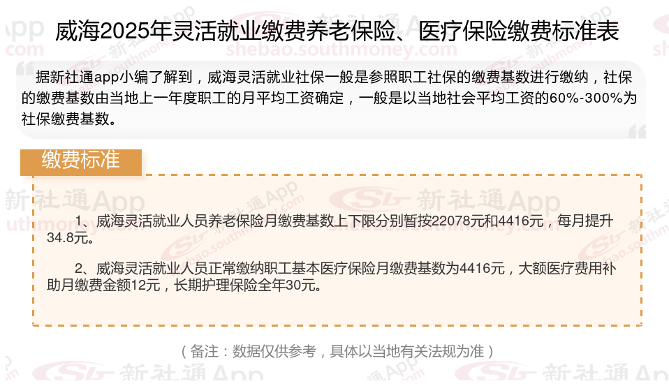 据新社通app数据显示,2024-2025年威海灵活就业人员养老保险的缴费标准: