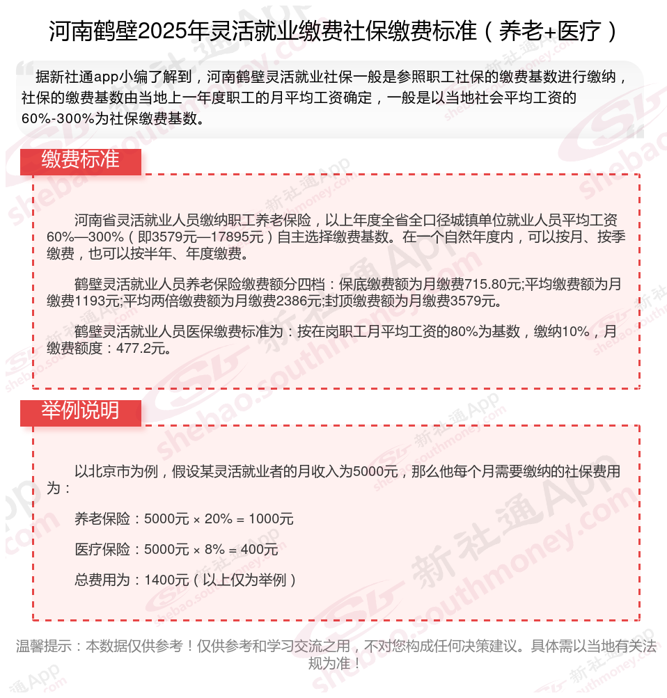 据新社通app数据显示,河南鹤壁灵活就业养老保险最低缴费基数为:3579元;个人的缴费比例分别为:20%;