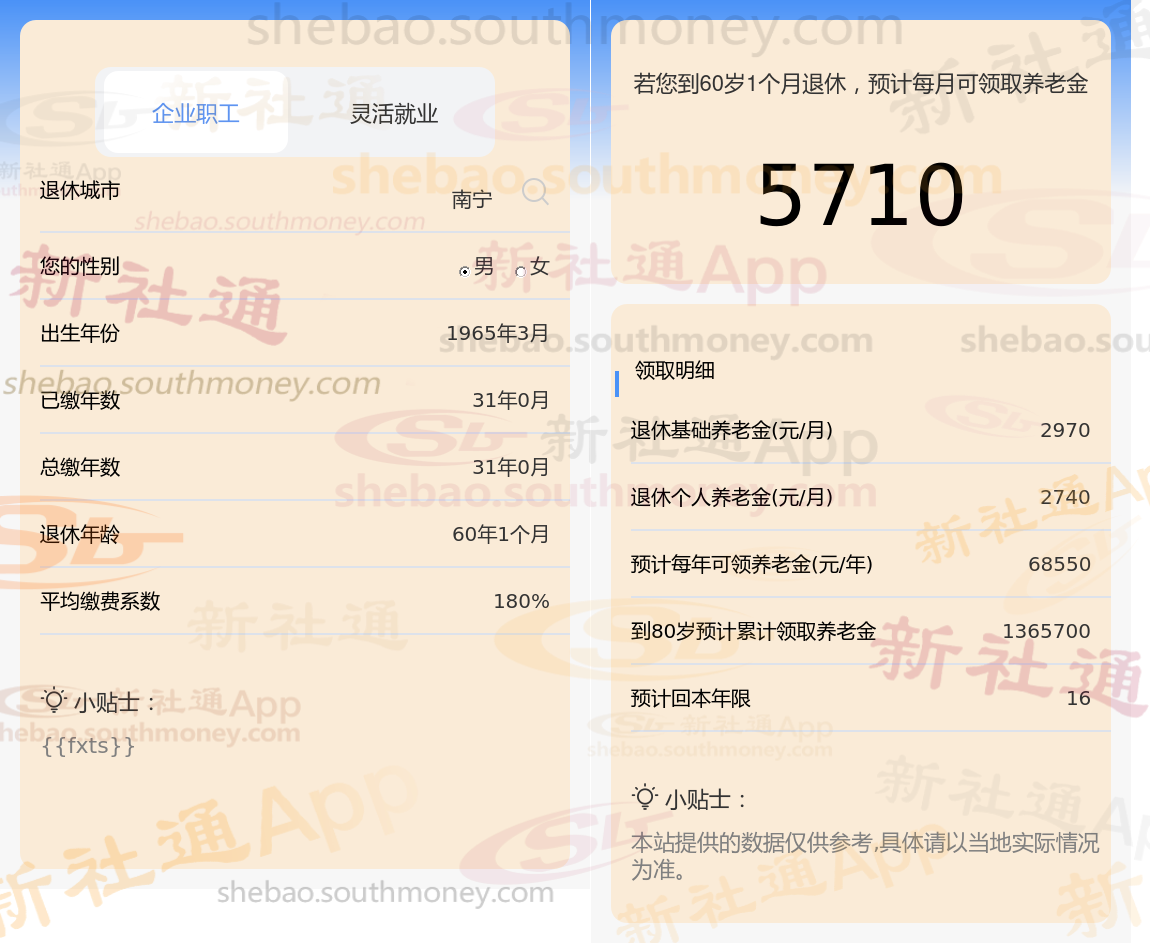 这是一位1965年出生的男性退休职工的个人档案,他来自南宁,已缴纳社保31年,且缴费档次为180%。通过新社通app养老金计算器得出: