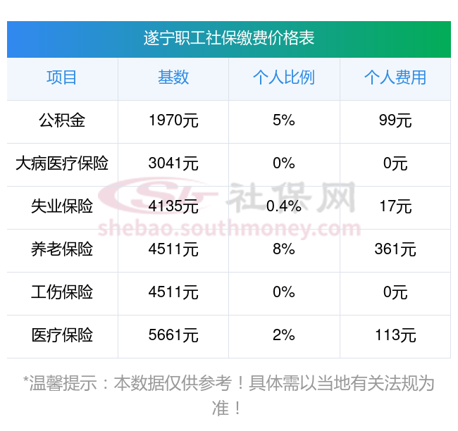 2025年遂宁社保缴费多少钱?遂宁社保公积金缴费基数为:3579.00元,个人比例:0.08,下表是2025遂宁社保费用明细参考,新社通app-社保缴费查询工具提供的最新数据如下: