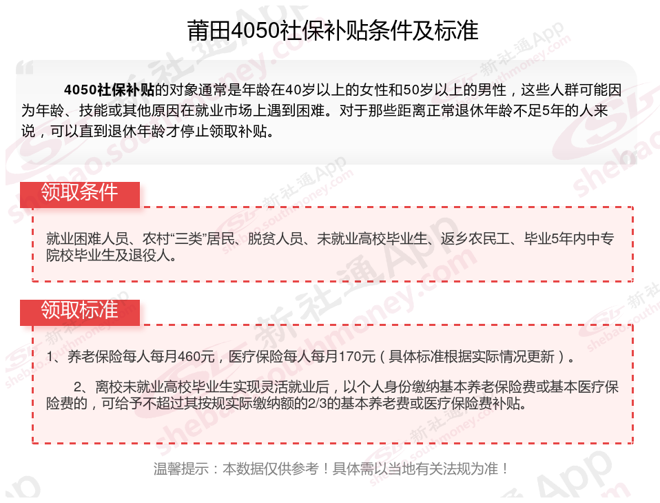 一、莆田4050社保补贴标准及条件2025年最新消息