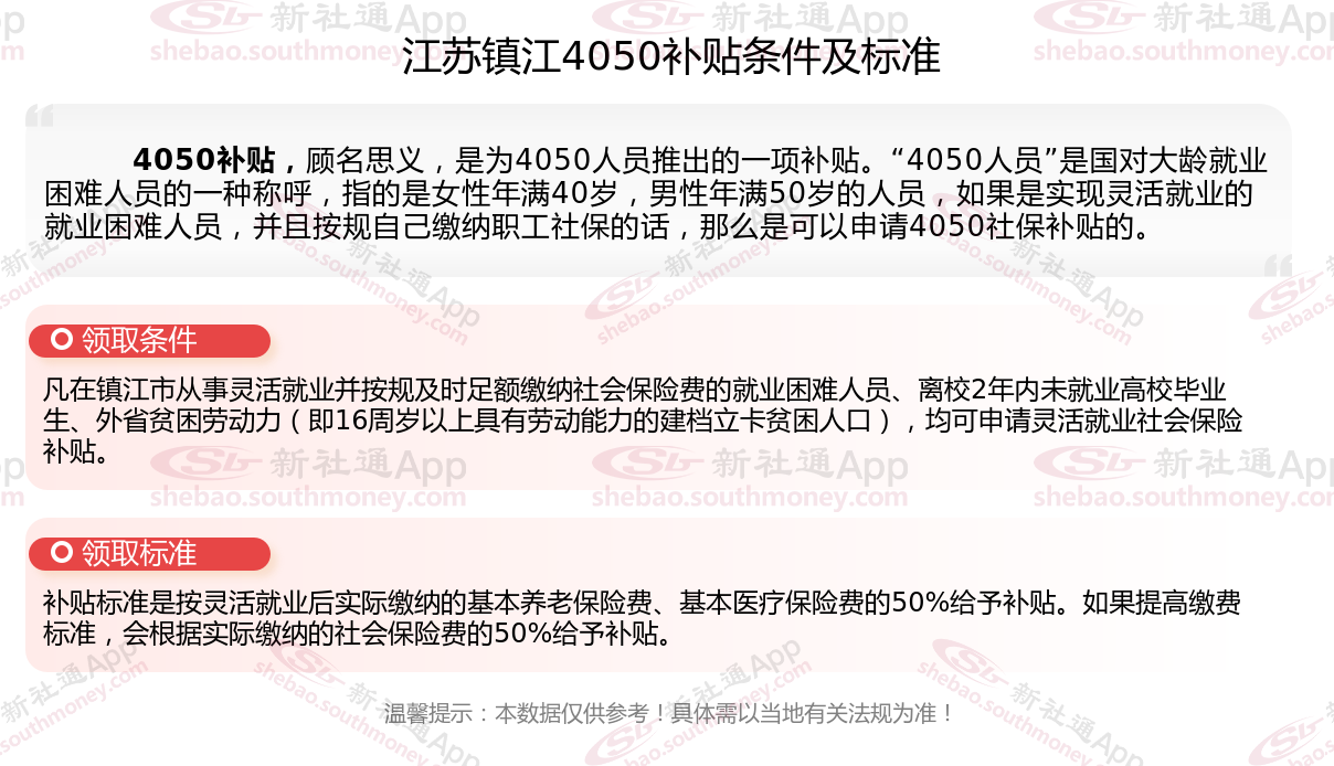 一、2025年江苏镇江4050社保补贴标准及条件是多少?