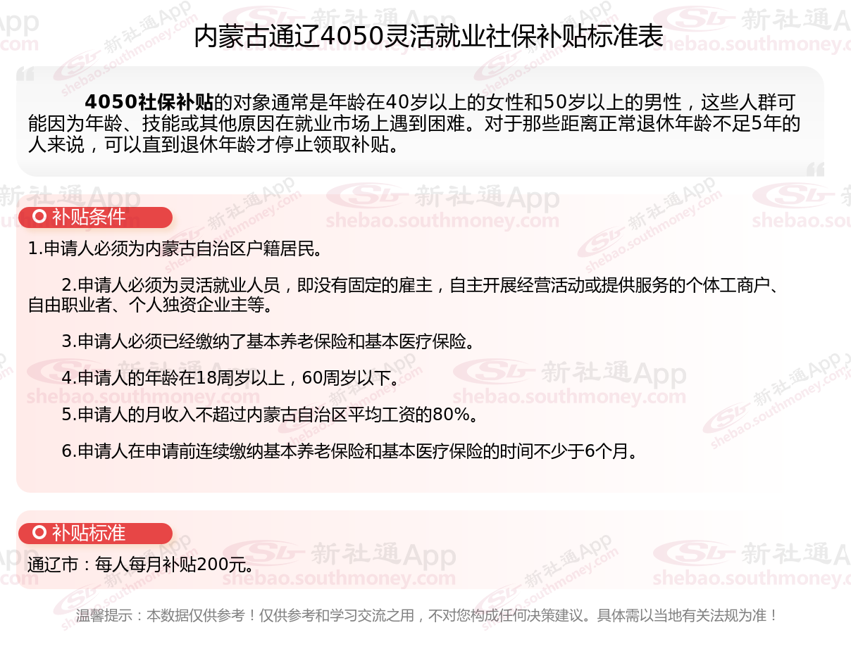 一、2023-2024年内蒙古通辽灵活就业4050社保补贴标准和条件是什么