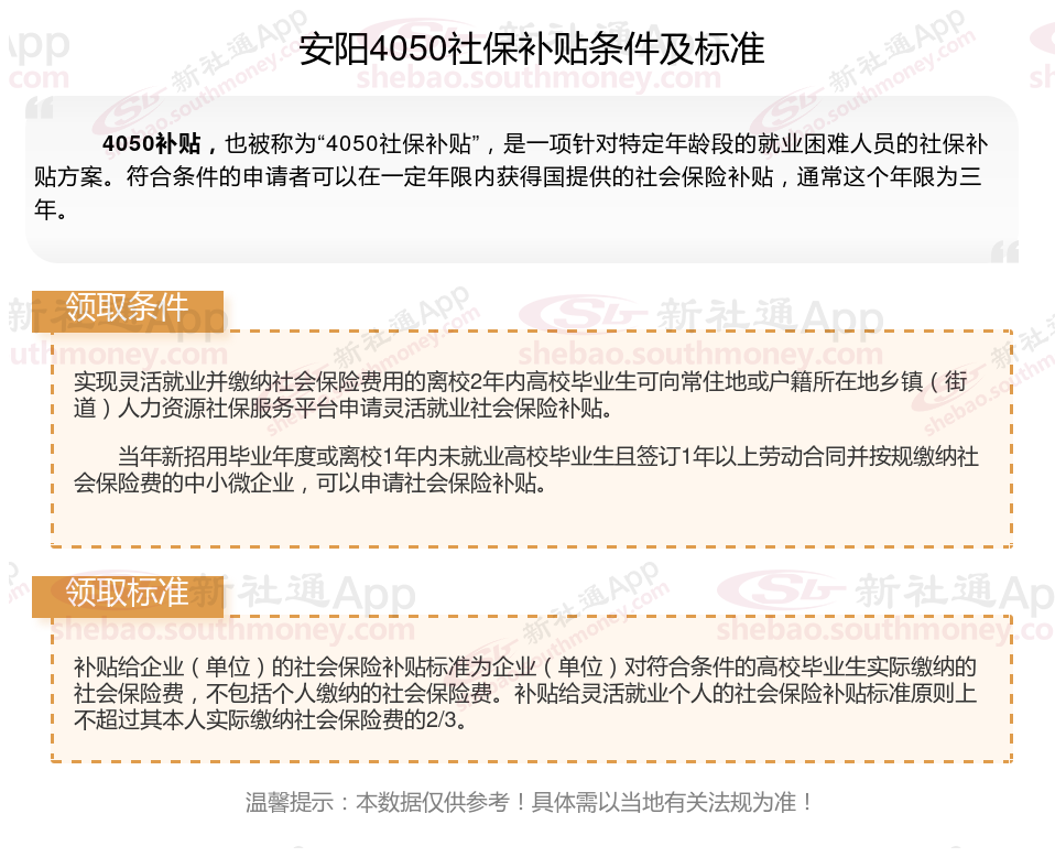 今天聊一下4050补贴话题。4050补贴听起来像是一个针对特定年龄人群的社保补贴。比如女性需年满40周岁,男性需年满50周岁(以申请当年12月31日为截止日期)。那么安阳4050灵活就业社保补贴标准是多少钱?安阳4050社保补贴条件是什么?接下来随新社通APP小编了解一下最新资讯。