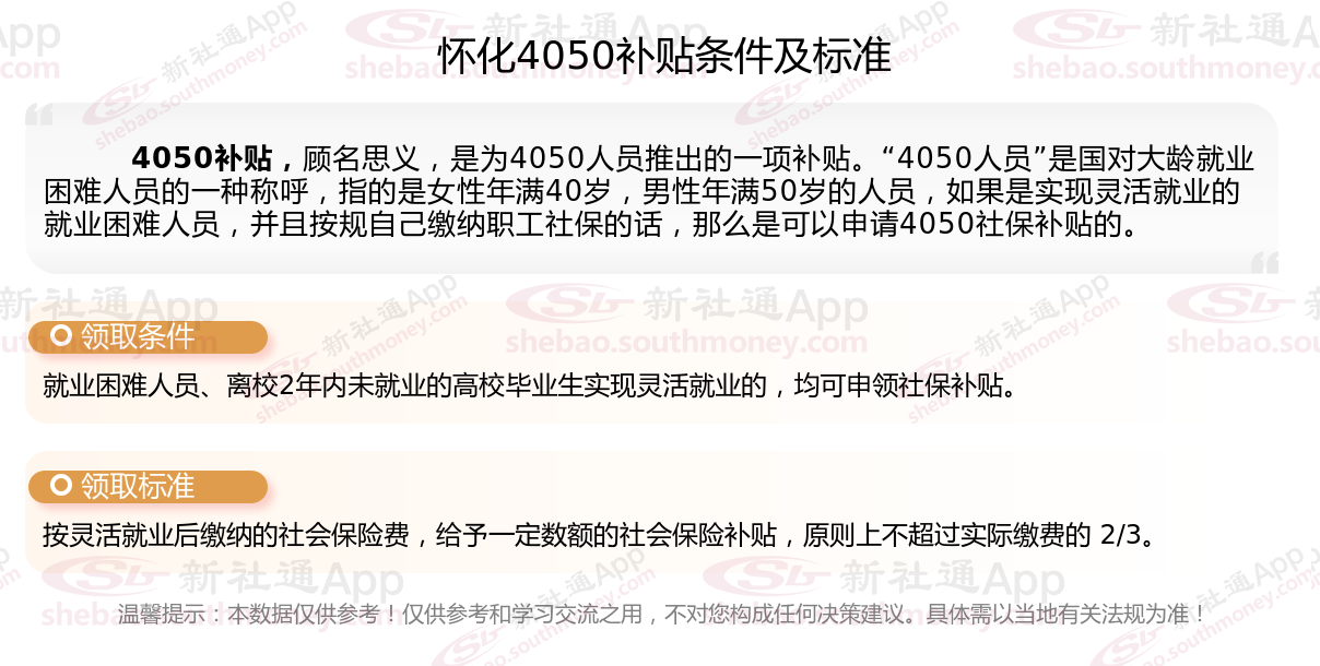 二、2025年怀化4050社保补贴标准及条件,最新如下: