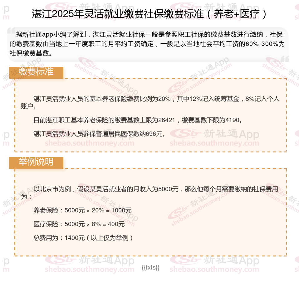 2025年湛江灵活就业人员社保交多少钱,你了解2025年湛江灵活就业人员社保缴费基数及比例吗,据新社通小编了解到,灵活就业社保缴费标准每年都会有所调整,主要体现在缴费基数和缴费比例上。接下来随新社通APP小编一起来看看。