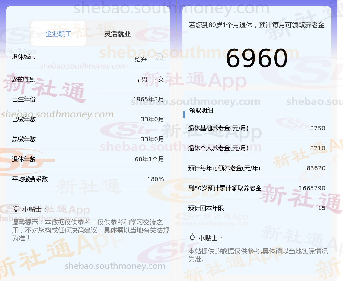 张某,绍兴人,1965年出生,是一名拥有33载社保缴费年限的退休男性,缴费档次稳定在180%。岁月流转,他终于迎来了自己的退休时光。借助新社通app养老金计算器计算所得,张某惊喜地发现,他每月可以领取到基础养老金大约3750元,再加上个人养老金约3210元,两项合计,他每月的养老金总额达到了6960元。虽然数额不大,但足以让他的退休生活充满温馨与安宁。