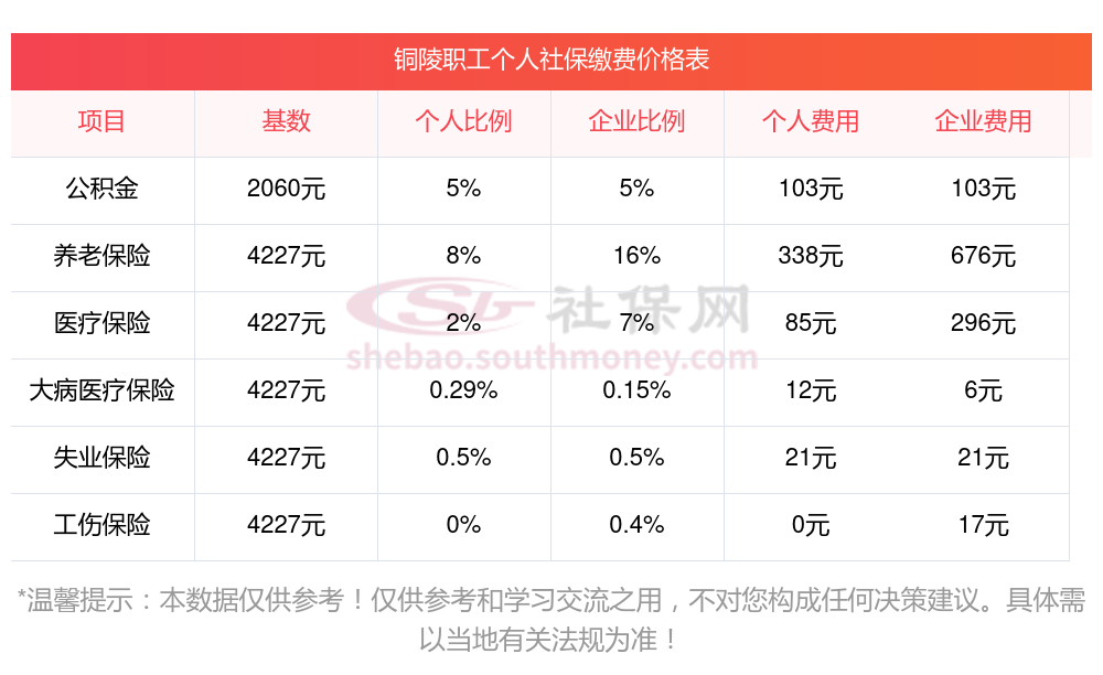 2025年铜陵社保缴费最低基数及个人和单位具体是多少钱?下表是2025年铜陵社保费用明细参考,新社通app-社保缴费查询工具提供的最新数据如下: