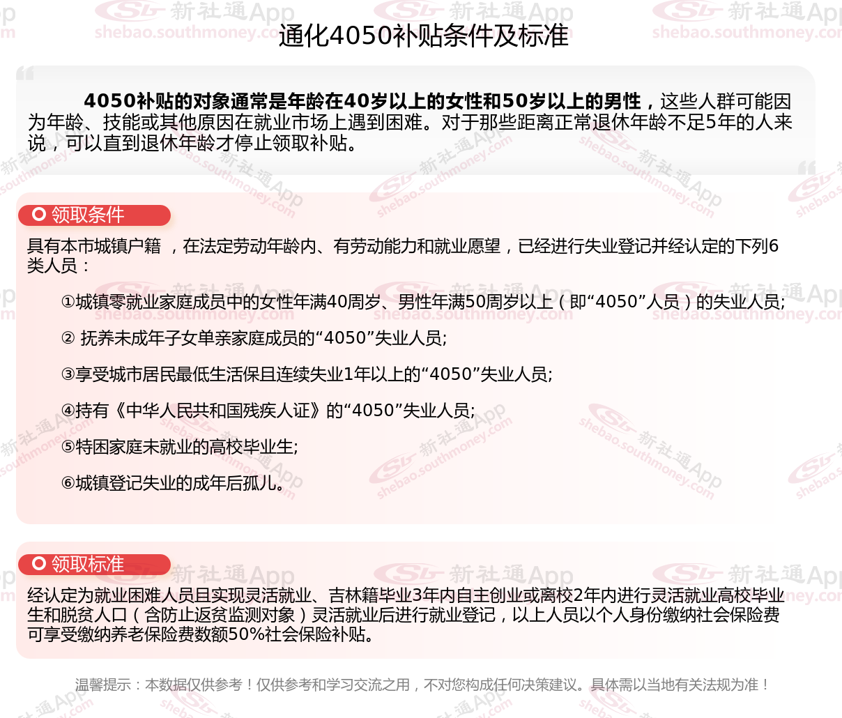 4050补贴需要以灵活就业身份参加职工养老和医疗保险,补贴标准不超过实际缴费的三分之二,最长3年,距离退休不足5年的可延长到退休。补贴对象包括国企下岗人员、低保家庭等。申请流程需要提交身份证、银行账户等。那么通化4050灵活就业社保补贴标准是多少钱?通化4050社保补贴条件是什么?接下来随新社通APP小编了解一下最新资讯。