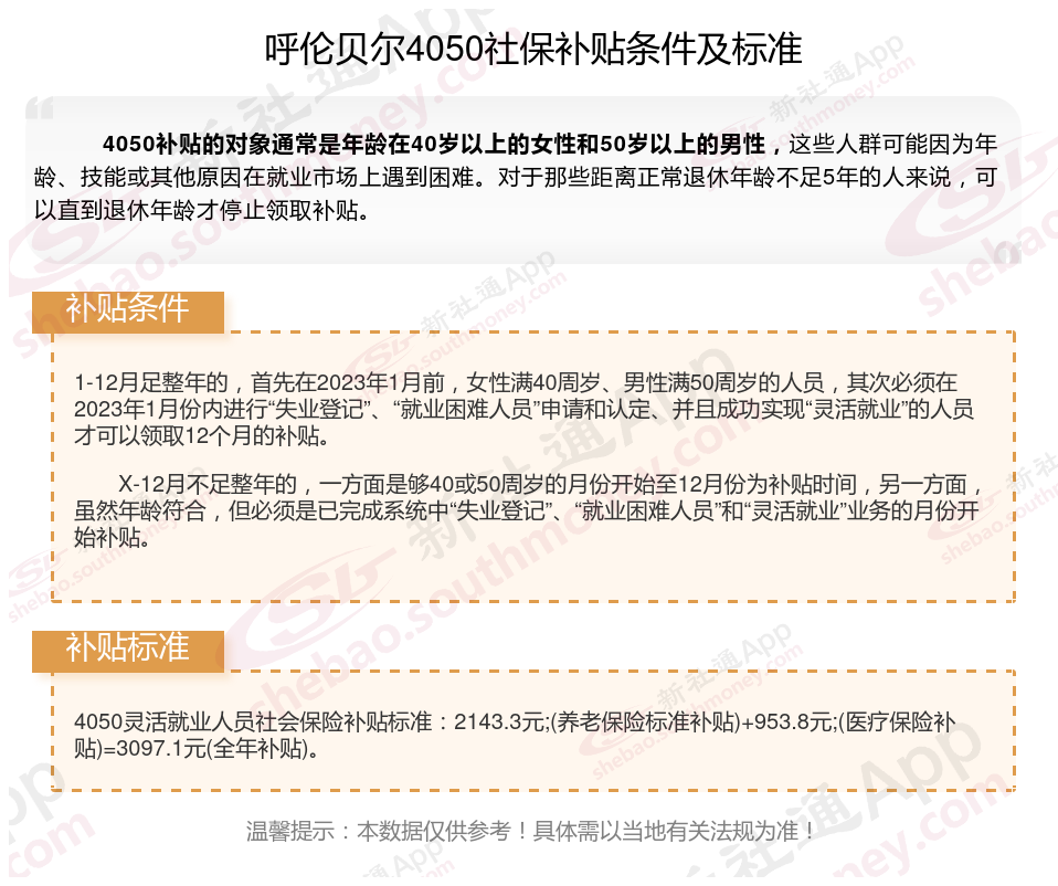 二、2025年呼伦贝尔4050社保补贴多少钱?4050社保补贴领取条件什么?