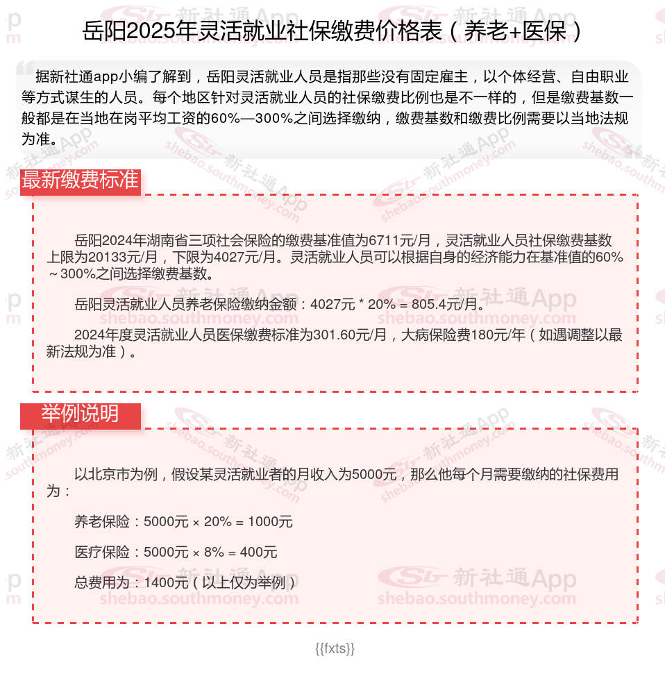 据新社通app数据显示,2024-2025年岳阳灵活就业人员养老保险的缴费标准: