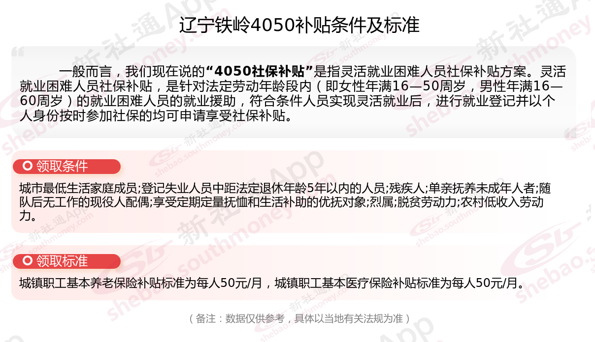 4050社保补贴标准据新社通app小编了解,通常,4050社保补贴包含基本医疗保险和基本养老保险两个险种,社保补贴金额为申请人实际缴纳基本养老保险和基本医疗保险金额的2/3,具体标准以当地社保局公布的数据为准!那么辽宁铁岭4050灵活就业困难人员社保补贴标准是多少?辽宁铁岭4050社保补贴需要符合什么条件?接下来随新社通APP小编具体了解一下4050社保补贴内容。