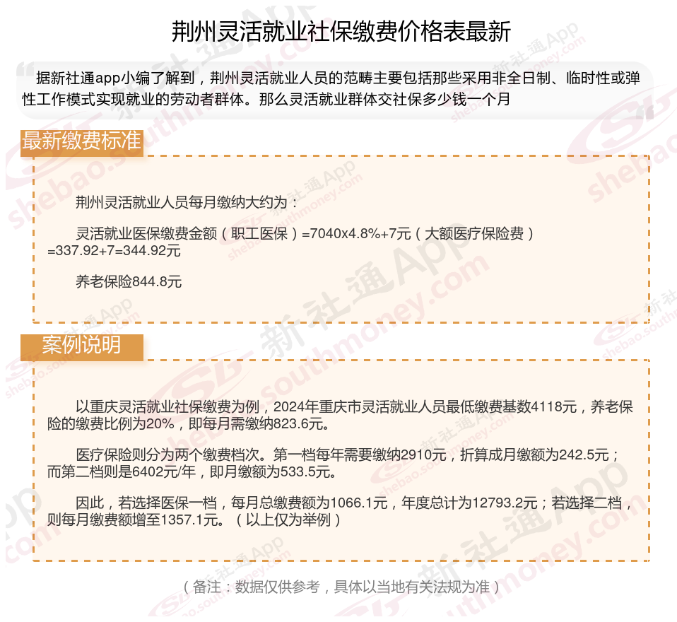 据新社通app数据显示,荆州灵活就业人员养老保险缴费基数2024-2025年最新标准如下: