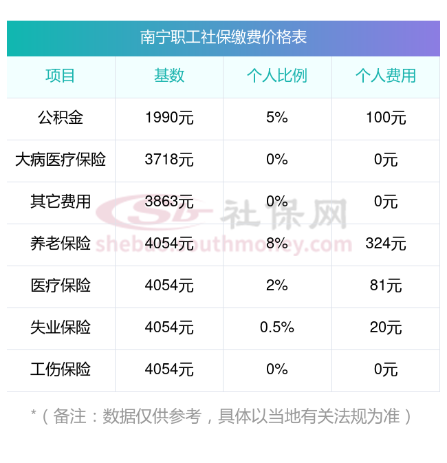 2025年南宁社保缴费多少钱?下表是2023-2024年南宁社保费用明细参考,新社通app-社保缴费查询工具提供的最新数据如下: