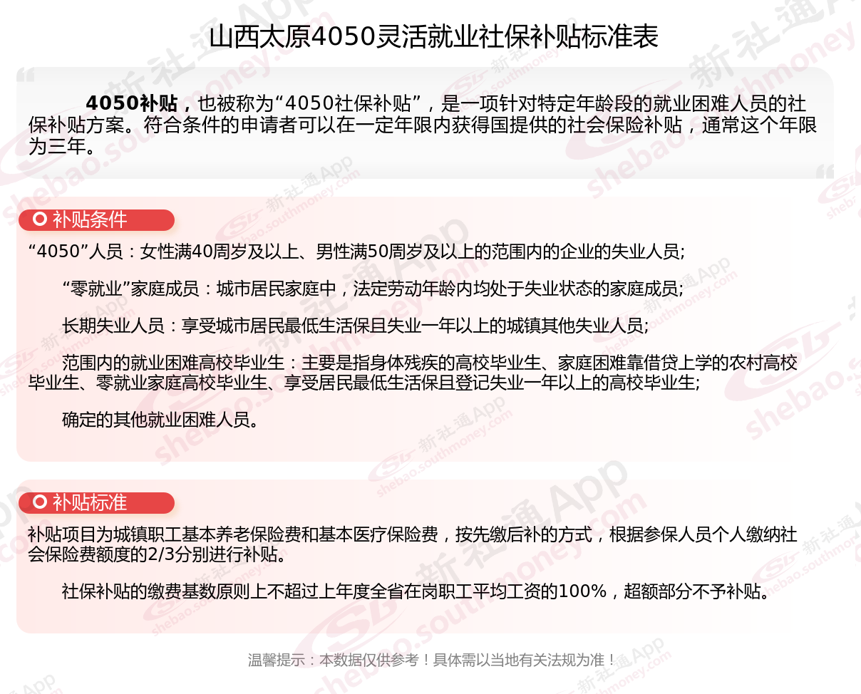 今天聊一下4050补贴的相关内容。4050补贴听起来像是一个针对特定年龄人群的社保补贴。比如女性需年满40周岁,男性需年满50周岁(以申请当年12月31日为截止日期)。那么山西太原4050灵活就业困难人员社保补贴多少钱?山西太原4050社保补贴可以申请吗?接下来随新社通APP小编具体了解一下4050社保补贴内容。