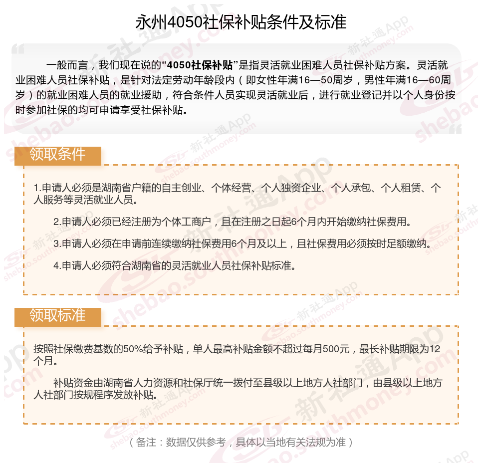4050补贴主要是针对大龄就业困难人群的社保补贴,申请条件包括年龄、就业困难、灵活就业并自费缴纳社保,需要持有失业登记证,不同地区可能有细微差别,比如农村户口的限制。那么永州4050灵活就业社保补贴标准是多少钱?永州4050社保补贴条件是什么?接下来随新社通APP小编了解一下最新资讯。