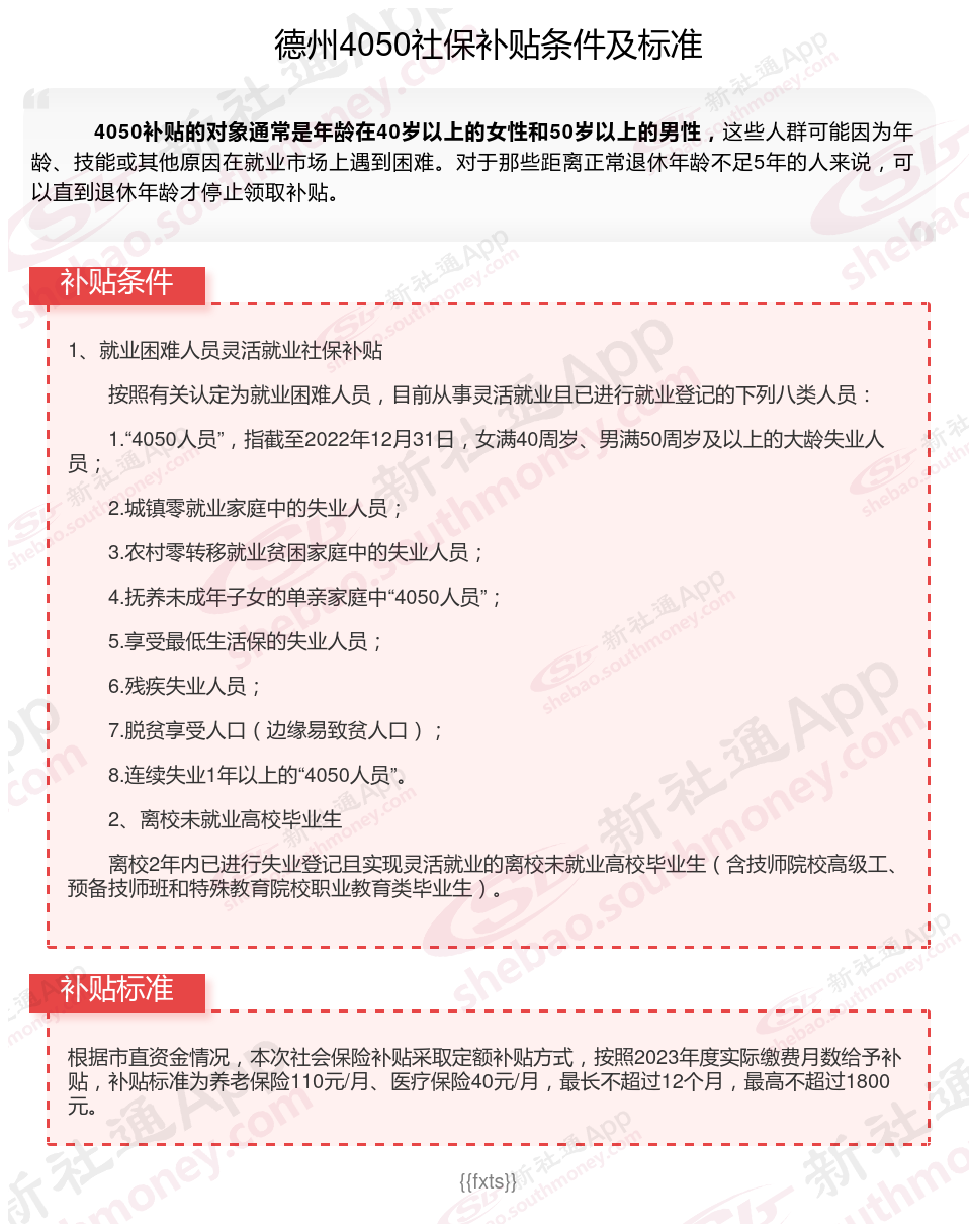 4050补贴主要是针对大龄就业困难人群的社保补贴,申请条件包括年龄、就业困难、灵活就业并自费缴纳社保,需要持有失业登记证,不同地区可能有细微差别,比如农村户口的限制。那么德州4050灵活就业社保补贴标准是多少钱?德州4050社保补贴条件是什么?接下来随新社通APP小编了解一下最新资讯。