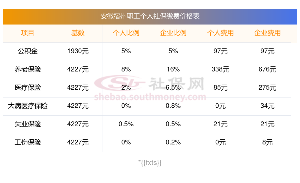 安徽宿州缴费社保比例一览 社保公司和个人各交多少?下表是2024-2025年安徽宿州社保费用明细参考,新社通app-社保缴费查询工具提供的最新数据如下: