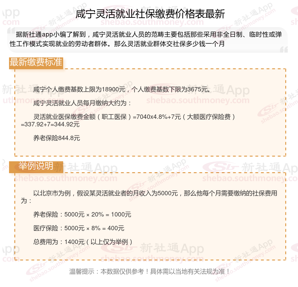 据新社通app数据显示,2024-2025年咸宁灵活就业人员养老保险的缴费标准是根据缴费基数来确定的: