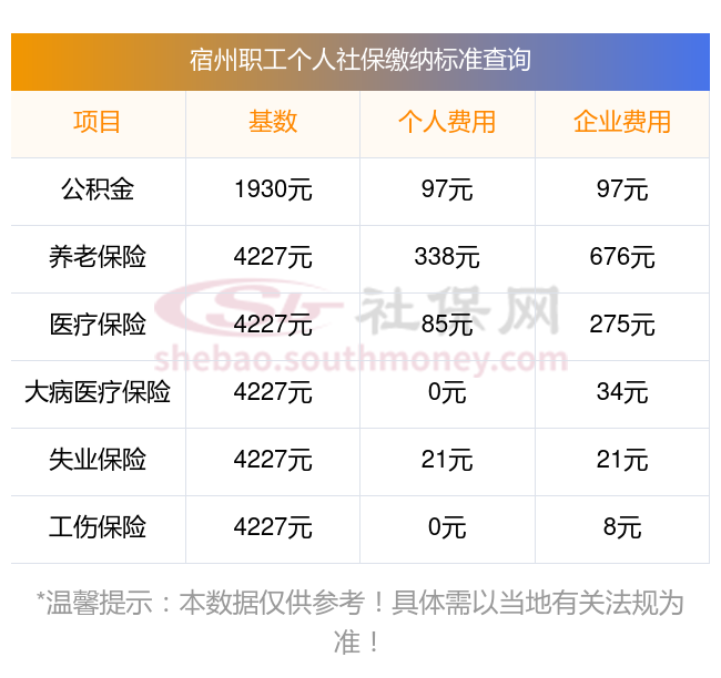 宿州五险一金交多少钱一个月?下表是2024-2025年宿州社保费用明细参考,新社通app-社保缴费查询工具提供的最新数据如下: