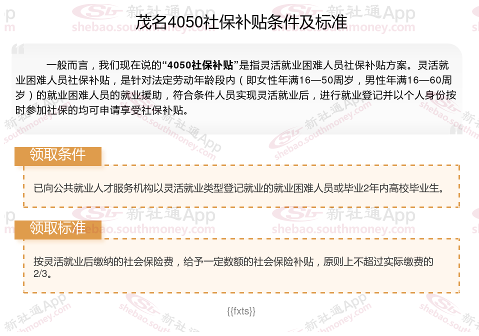 二、茂名4050社保补贴标准及条件4050社保补贴,最新如下