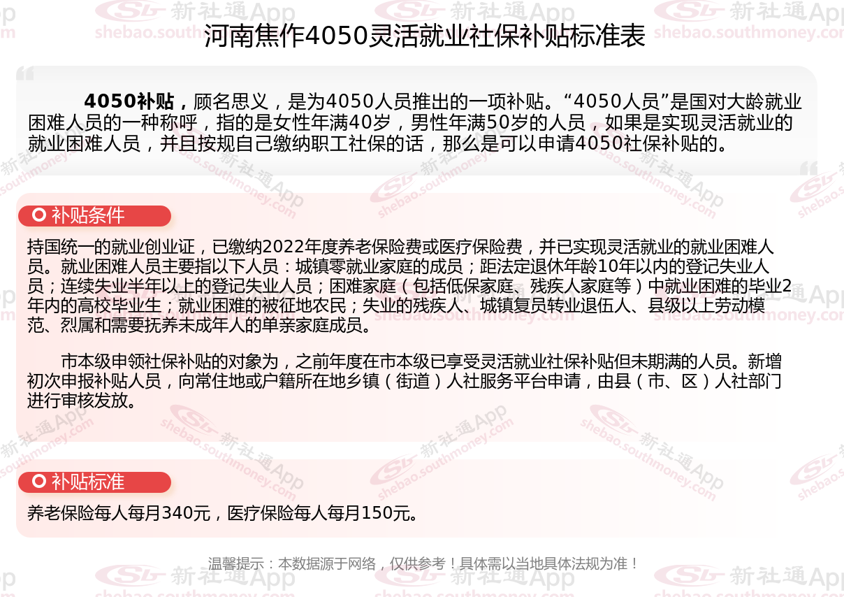 二、2025年河南焦作4050社保补贴标准是多少?领取条件是什么?