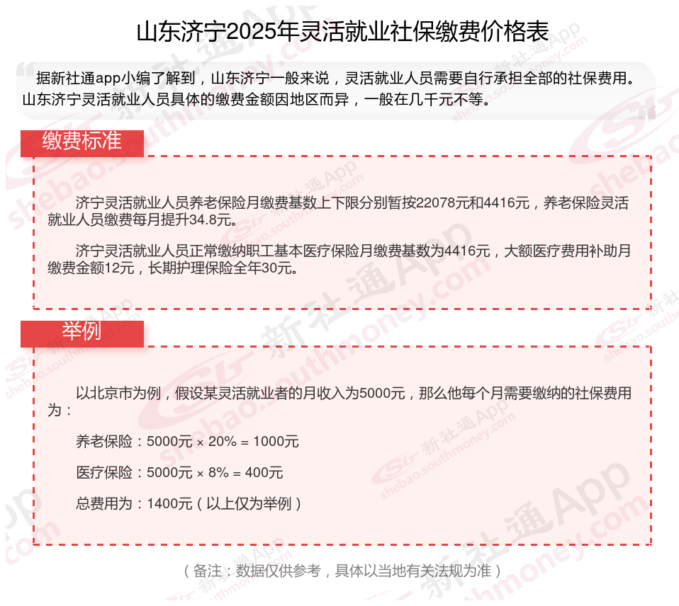 据新社通app数据显示,2024-2025年山东济宁灵活就业人员养老保险的缴费标准是根据缴费基数来确定的: