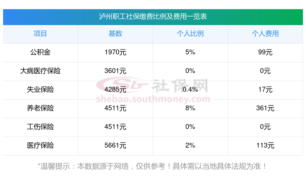 2025年泸州社保缴费多少钱?泸州社保公积金缴费基数为:3579.00元,个人比例:0.08,下表是2025泸州社保费用明细参考,新社通app-社保缴费查询工具提供的最新数据如下:
