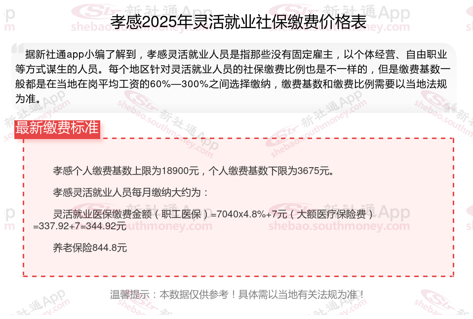 孝感灵活就业社保缴费标准,孝感社保缴费多少钱?下表是2024-2025年孝感社保费用明细参考,根据新社通app-社保缴费查询工具提供的最新数据如下:
