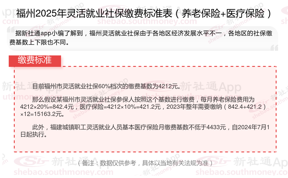 此外,福建城镇职工灵活就业人员基本医疗保险月缴费基数不低于4433元,自2024年7月1日起执行。