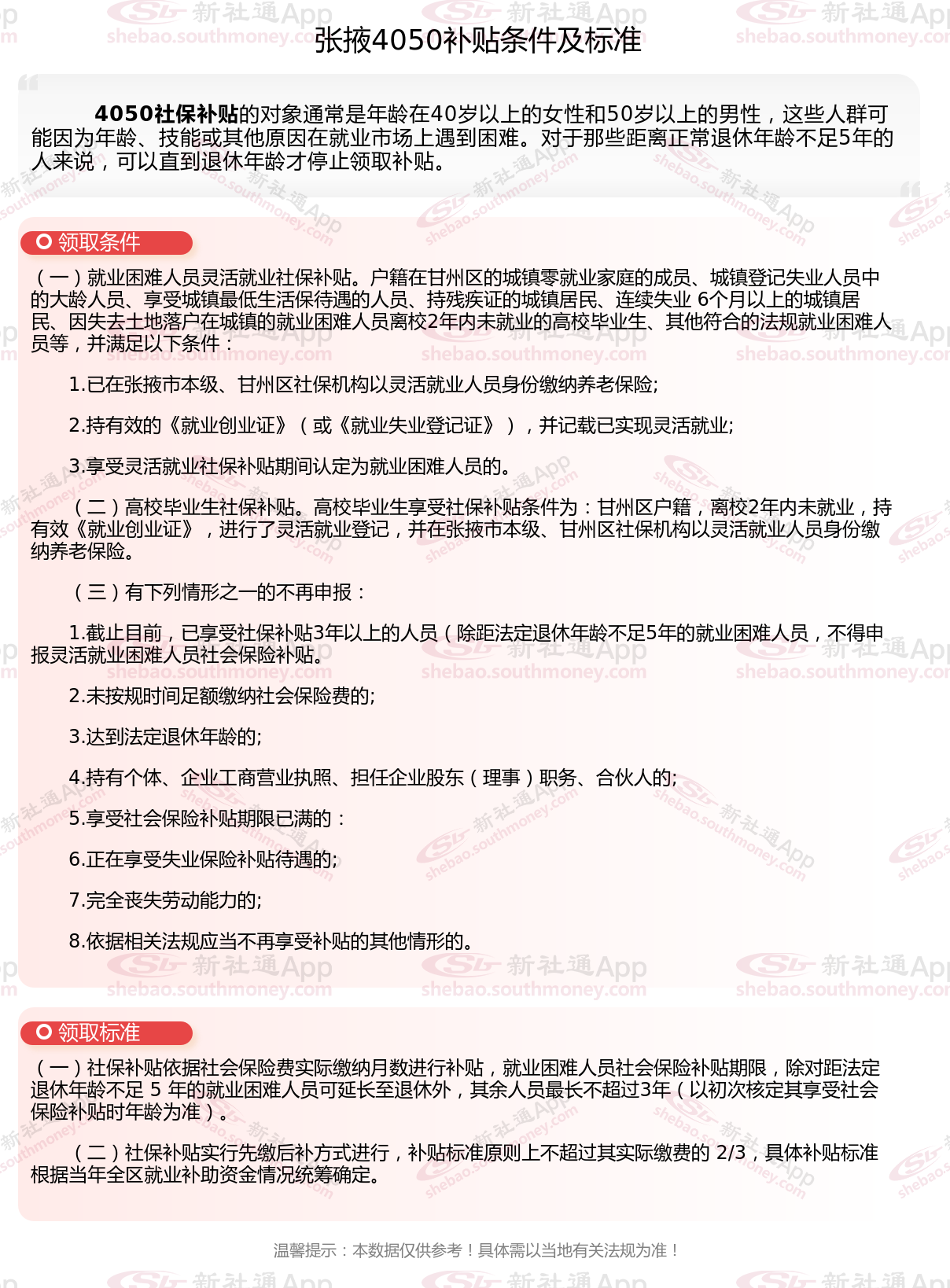 一、2023-2024年张掖4050社保补贴标准及条件是多少?
