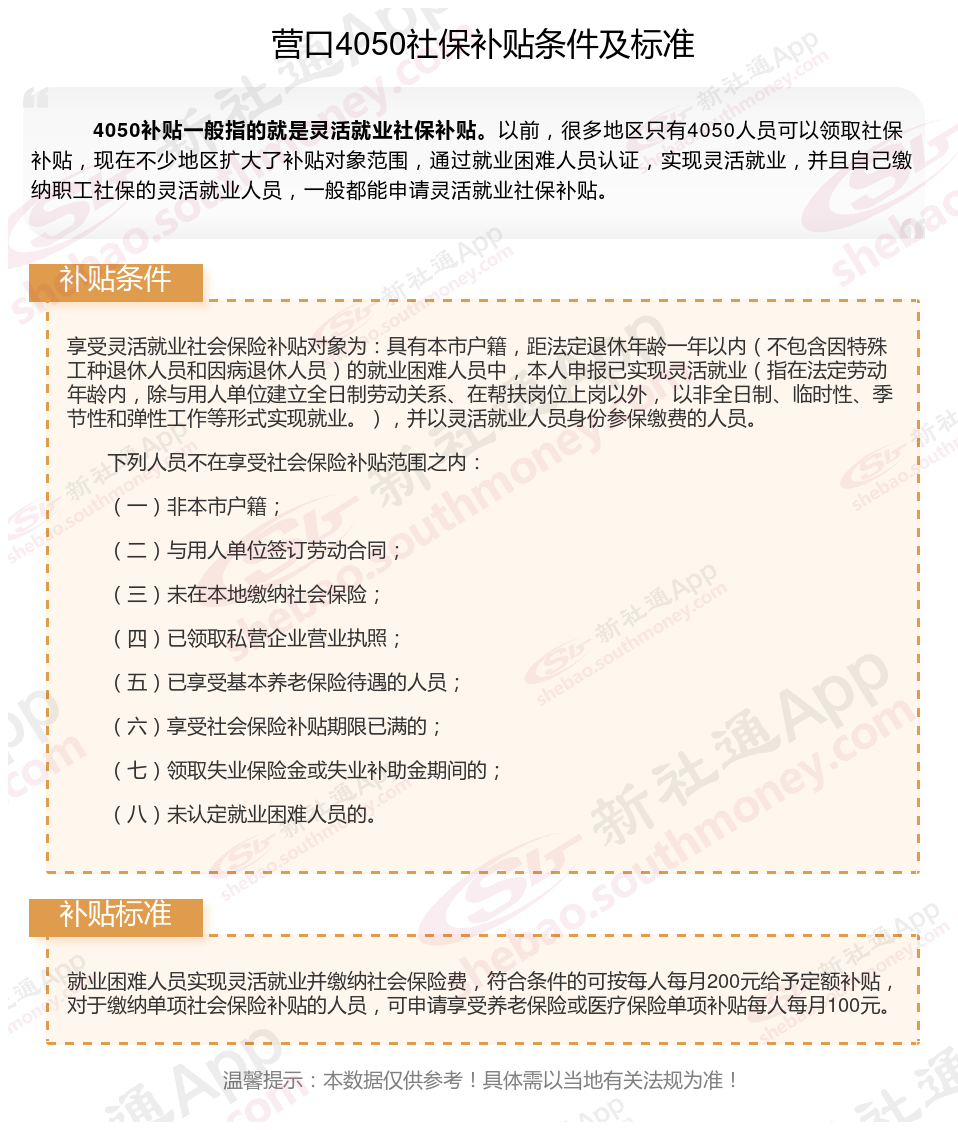 今天聊一下4050补贴的相关内容。4050补贴听起来像是一个针对特定年龄人群的社保补贴。比如女性需年满40周岁,男性需年满50周岁(以申请当年12月31日为截止日期)。那么营口4050灵活就业困难人员社保补贴多少钱?营口4050社保补贴可以申请吗?接下来随新社通APP小编具体了解一下4050社保补贴内容。