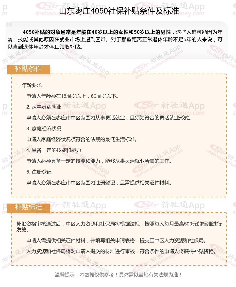 今天聊一下4050补贴话题。4050补贴听起来像是一个针对特定年龄人群的社保补贴。比如女性需年满40周岁,男性需年满50周岁(以申请当年12月31日为截止日期)。那么山东枣庄4050灵活就业社保补贴标准是多少钱?山东枣庄4050社保补贴条件是什么?接下来随新社通APP小编了解一下最新资讯。