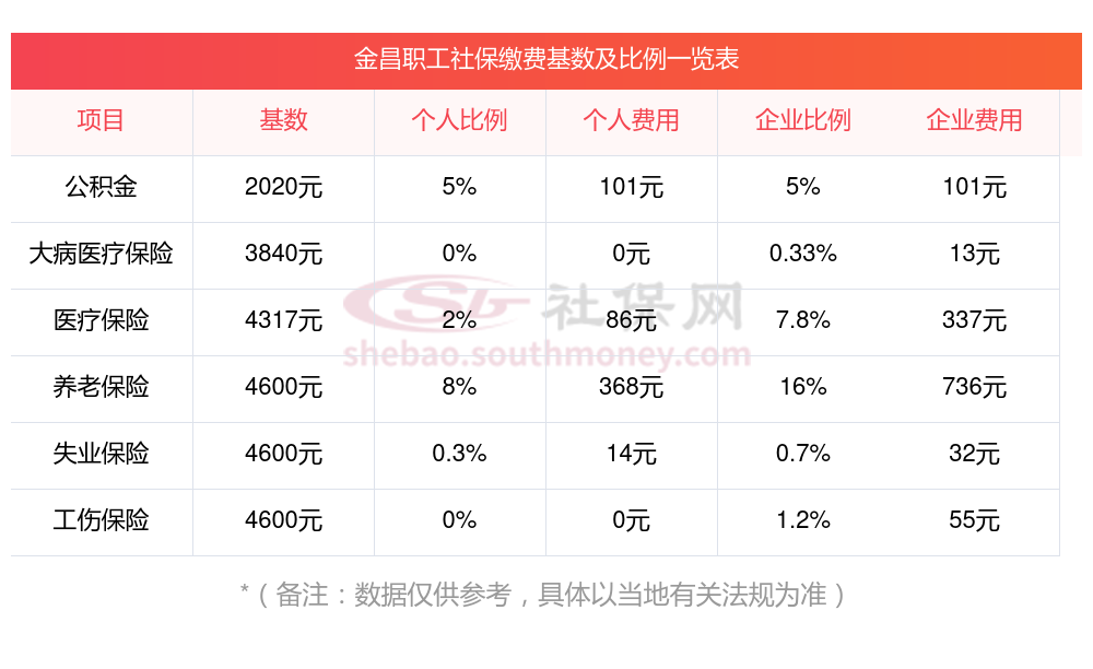 2025年金昌社保缴费多少钱?下表是2024-2025年金昌社保费用明细参考,新社通app-社保缴费查询工具提供的最新数据如下: