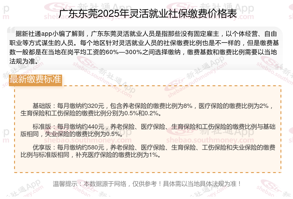 广东东莞灵活就业社保2025年收费标准是多少钱,主要由当地的在岗平均工资和缴费基数来定。其次,灵活就业社保缴纳跟职工缴纳不同的地方在于,灵活就业社保参保只能参保养老保险和医疗保险,且缴纳比例完全由个人承担。另外,灵活就业人员社保参保选择,可自由选择参保城镇职工社保和城乡居民保险。2025年广东东莞灵活就业社保缴多少钱?如何缴纳?怎么计算待遇?新社通APP小编将在下文为您详细说明。