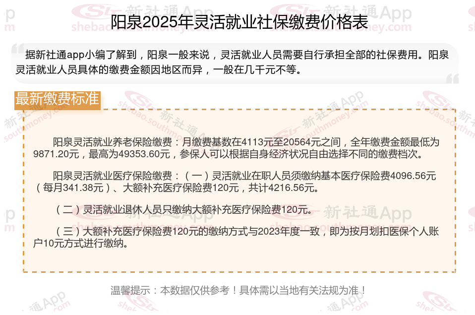 据新社通app数据显示,阳泉企业灵活就业养老保险的缴费基数为:4113元。
