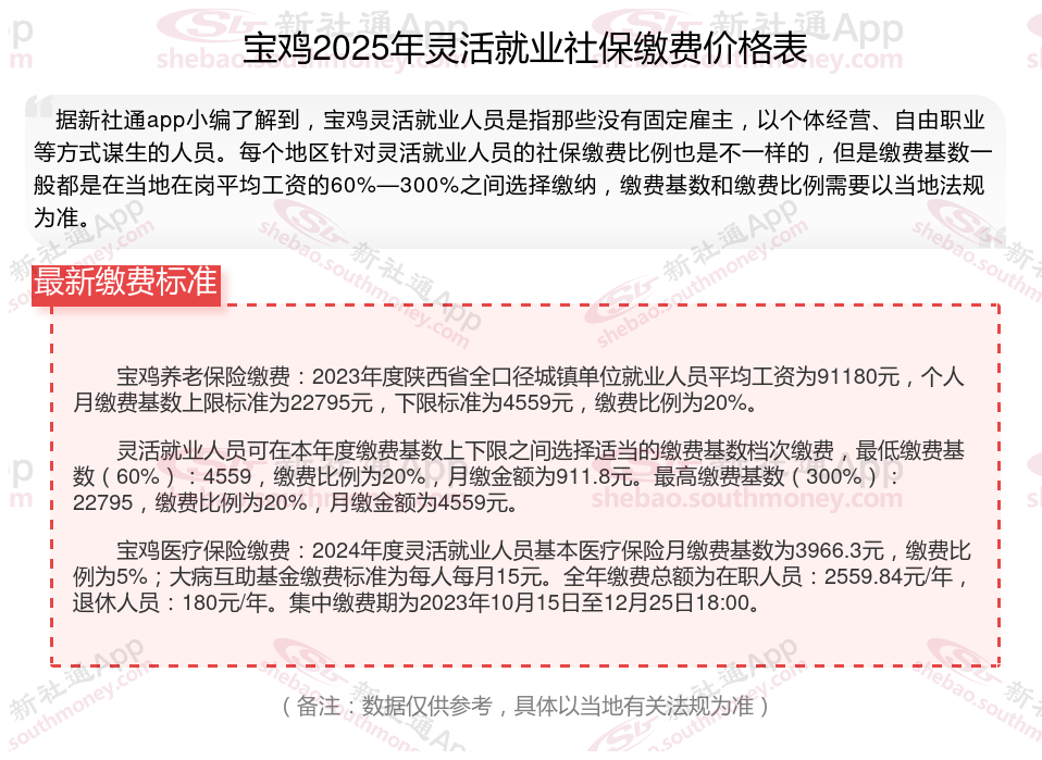 据新社通app数据显示,宝鸡灵活就业养老保险的缴费基数为:4559元。灵活就业人员参保缴费的比例为个人20%。