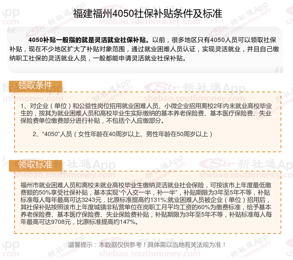 今天聊一下4050补贴的相关内容。4050补贴听起来像是一个针对特定年龄人群的社保补贴。比如女性需年满40周岁,男性需年满50周岁(以申请当年12月31日为截止日期)。那么福建福州4050灵活就业困难人员社保补贴多少钱?福建福州4050社保补贴可以申请吗?接下来随新社通APP小编具体了解一下4050社保补贴内容。
