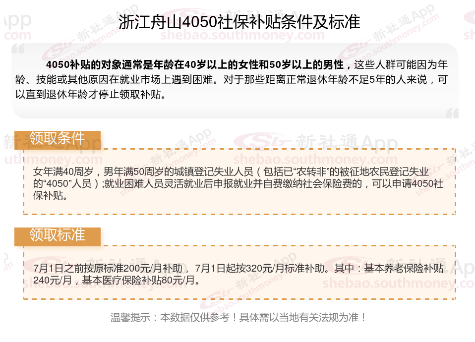 一、2023-2024年浙江舟山4050社保补贴标准及条件是多少?