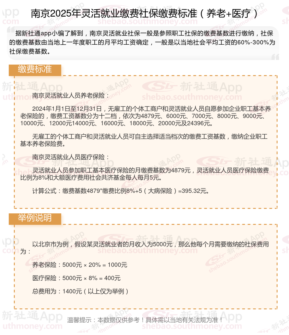 一、2025年南京灵活就业人员社保养老+医保缴费标准一年多少钱?