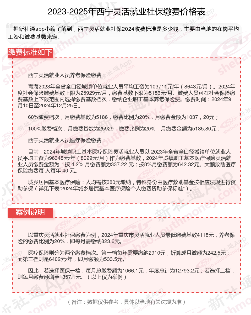 那么,灵活就业者社保是多少钱一个月 西宁灵活社保交多少钱?根据新社通app-社保缴费查询工具提供的2025社保缴费标准详情数据: