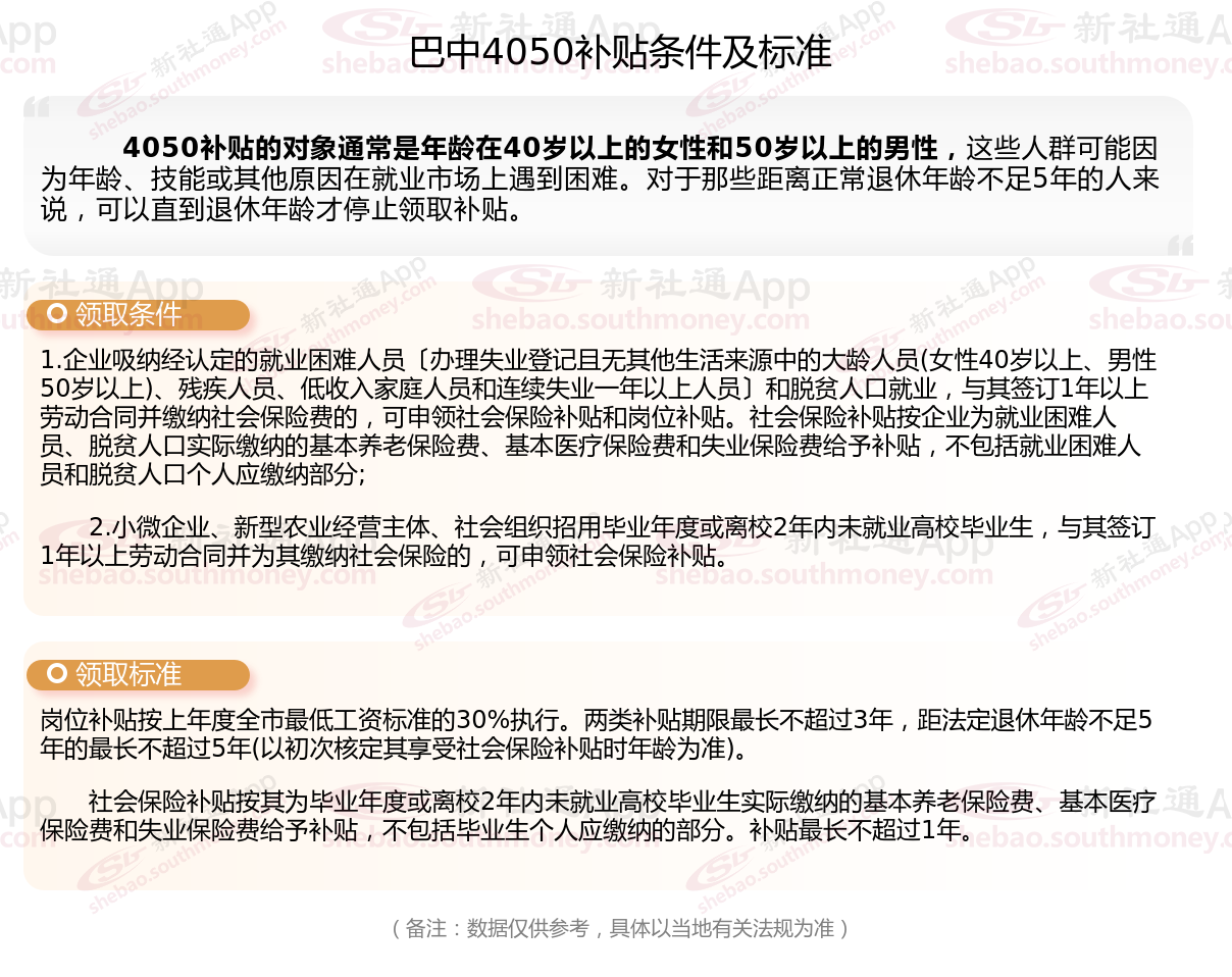 二、2025年巴中4050社保补贴标准是多少?领取条件是什么?