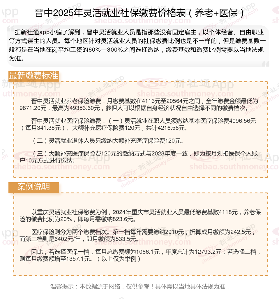 据新社通app数据显示,晋中灵活就业人员养老缴费基数2024-2025年最新标准如下: