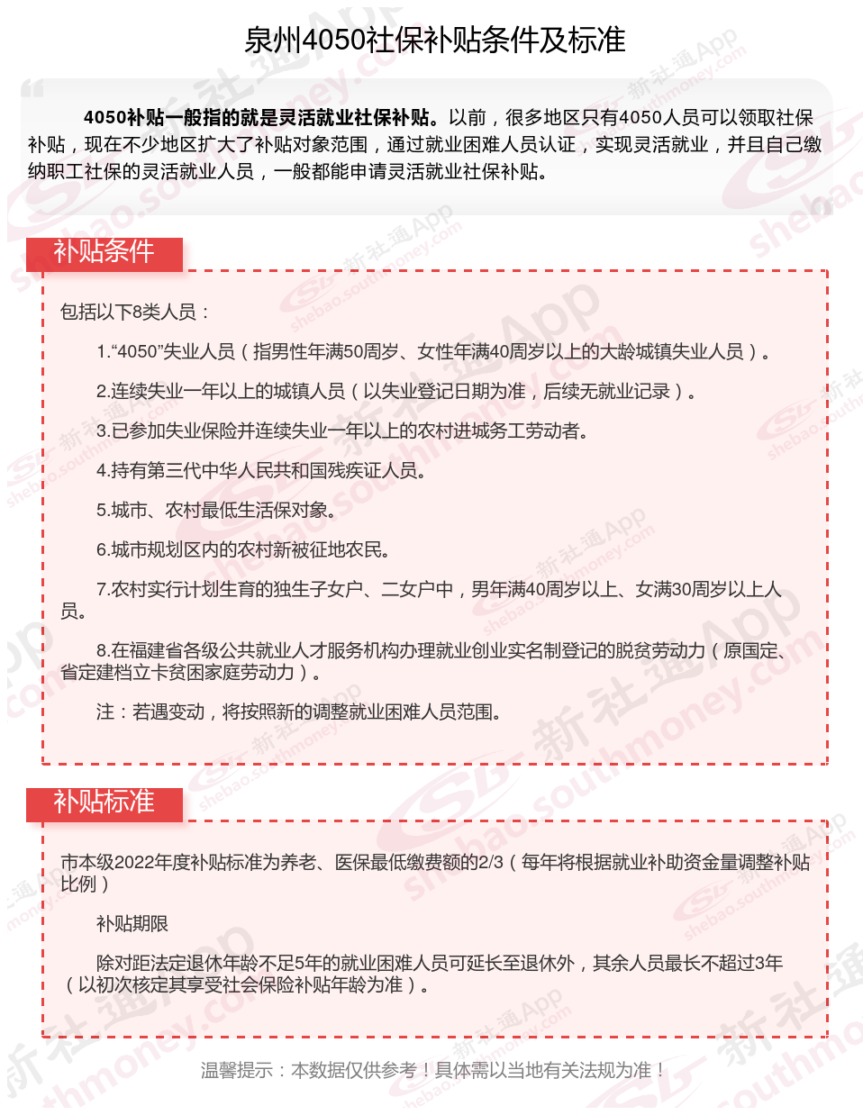 一、2025年泉州4050社保补贴标准及条件是多少?