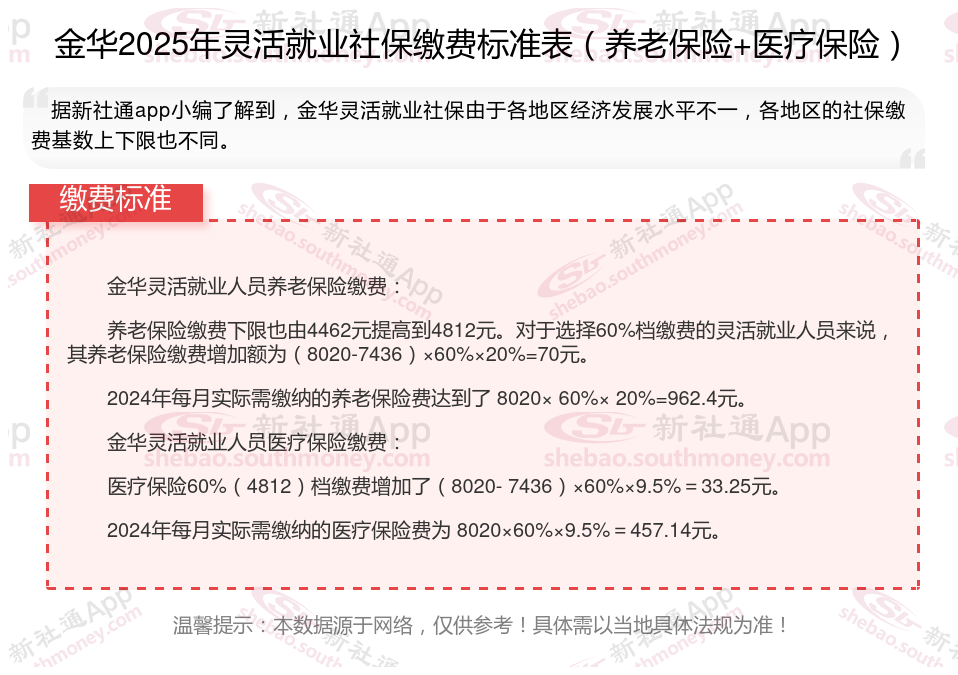 据新社通app数据显示,2024-2025年金华灵活就业人员养老保险的缴费标准是根据缴费基数来确定的: